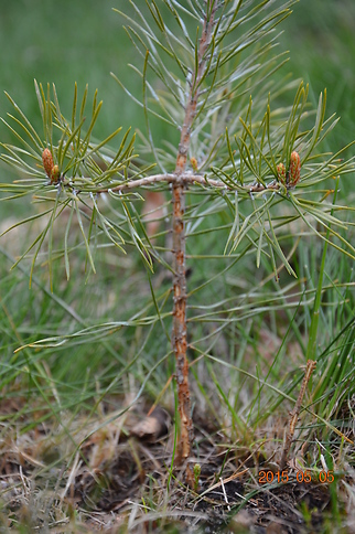 Tallplantorna är snytbaggens favoriter. Beståndet planterades omarkberett våren -14 direkt efter avverkning med kembehandlade plantor. Först planterades stora gran barrot 40 - 60 cm i 2-metersförband (2000 - 2500/ha) och därefter fylldes det på med 700 - 800 tall täckrot/ha.